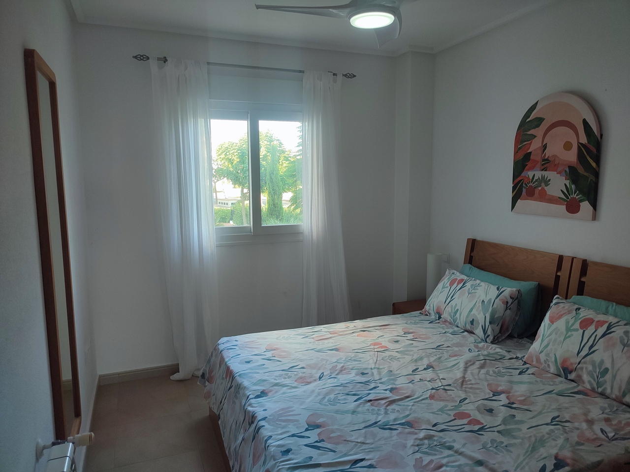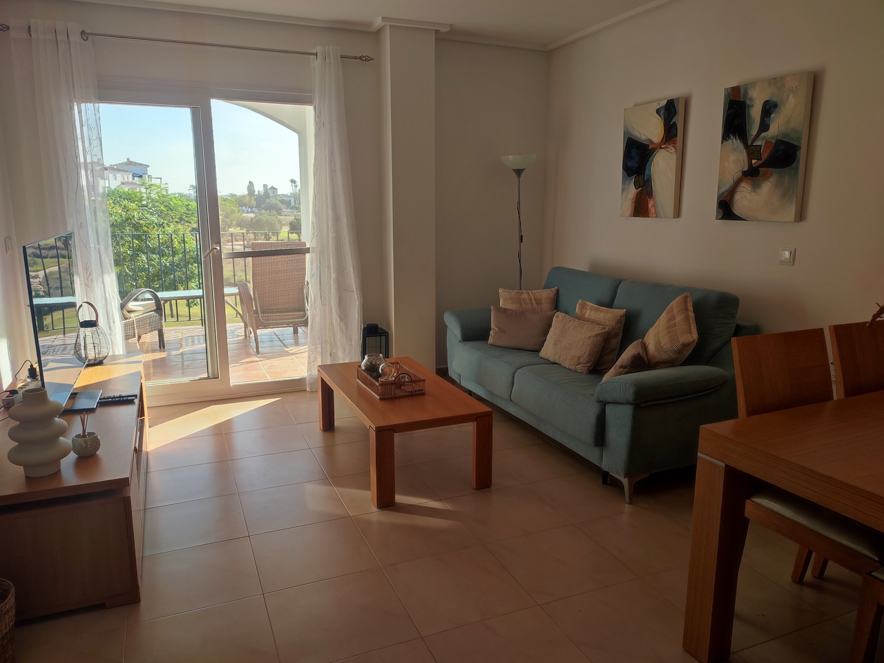 This corner apartment on the first floor has a sunny large terrace with sweeping views over the gardens, golf and lakes. It has a miodern walkin shower with a window. The apartment is being sold fully furnished minus personal possessions and also includes a private storeroom in the underground parking space.It would make an excellent holiday home or suitable for permanent living.The first thing that impresses you about Hacienda Riquelme Golf Resort is the wide-open spaces, the extensive gardens and the low-density construction, which create a relaxing environment to enjoy a very safe and peaceful life or holiday. The apartments are set out spaciously around the magnificent and challenging 18 hole golf course part of the Jack Nicklaus Golf Trail.All apartments have unlimited internet, air-conditioning for summer and heating for winter, private underground parking space and a communal lift.In the heart of the resort you will find the beautiful renovated Hacienda where you will find a supermarket, clubhouse, restaurant and bar. The inner court yard becomes the hive of entertainment in the Summer, whilst the large terrace set in the stunning gardens is open all year for “al fesco” dining and drinking.Facilities:Gated Community.24 hour security."El Cason" Bar, Restaurant, Clubhouse. "Sips" Coffee ShopSupermarket.Summer Entertainment.19 large community swimming pools.Communal gardens.Trees, 5 lakes.Wild flowers & local wildlife.Driving range & Golf ShopTennis courts.Paddle tennis courts.Football / Basketball court.Outside gym area.Children's play areas.Hacienda Riquelme is very well connected by the main motorways. Murcia Airport (20 mins)Mar Menor beaches (15 mins)Mediterranean beaches (20 mins)For those who like historical buildings, architecture or a desire to shop, the lovely cities of Murcia and Cartagena provide plenty of entertainment. Murcia (30 mins)Cartagena (45 mins) Murcia Airport (20 mins)Near to the bustling popular village of Sucina with shops, restaurants, bars, chemist, supermarket and lots more (5 minutes)For more information on the apartments available please contact us.